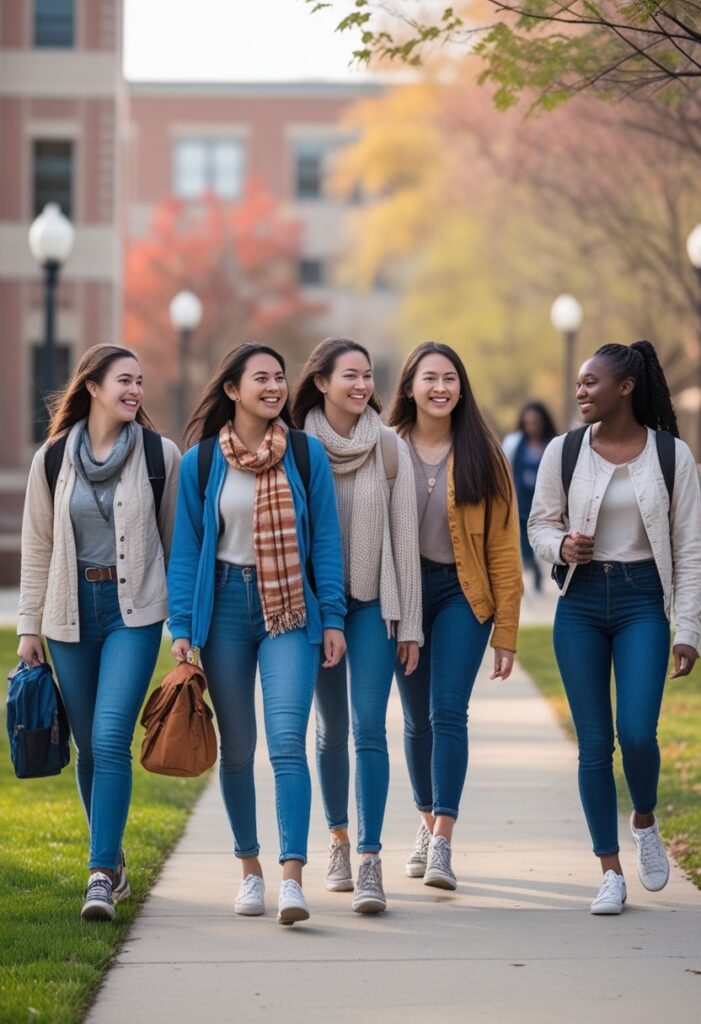 A group of college girls wearing casual daily outfits on a campus, walking and talking with books and backpacks.